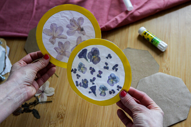 Z barevného, nejlépe žlutého papíru nejprve vystřihnete kulaté rámečky. Na ně nalepíte kruh z voskovaného papíru s vylisovanými květinami. Slepíte obě poloviny k sobě a můžete zdobit okna. Doporučujeme je na okno připevnit lepicí gumou, abyste je mohli bez poškození přemisťovat. Můžete do barevného rámečku klidně udělat dvě dírky a pověsit je na terasu, aby si s nimi mohl pohrávat vítr.