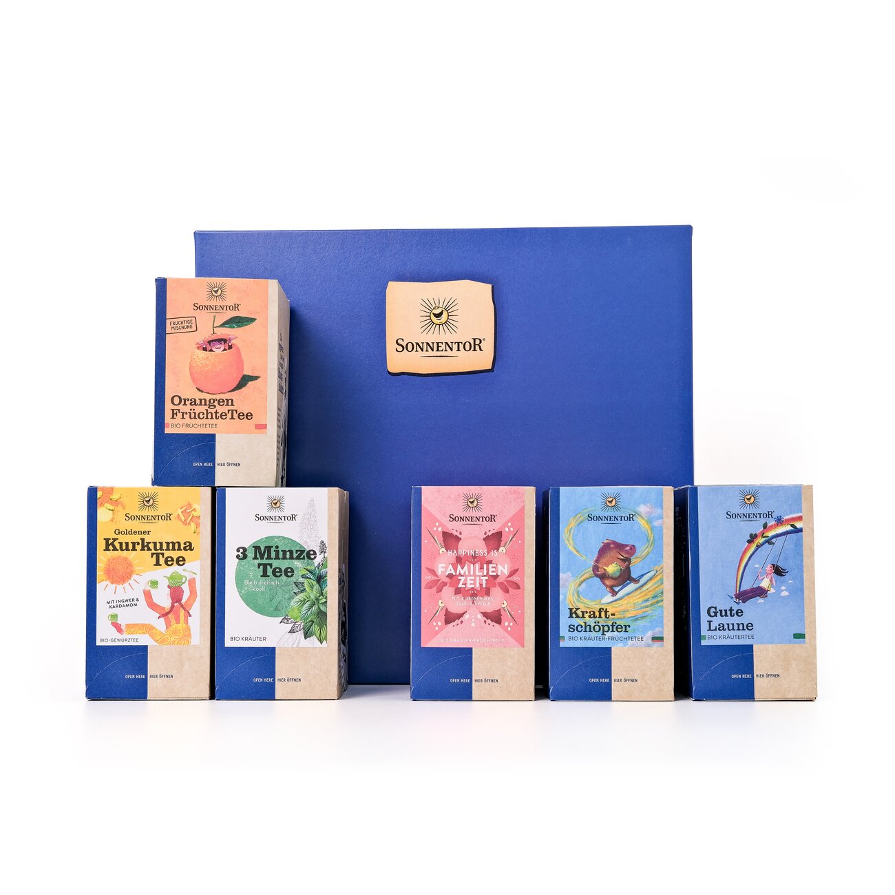 Content: Golden Turmeric Tea org., double chamber bag, Orange Fruit Tea org., double chamber bag, Family Time Tea Happiness is® org., double chamber bag, Cheery Herbal Tea org., double chamber bag, 3-Mint Tea org., double chamber bag. You can find the ingredients, nutrition information and allergens of each kind at the equal product.